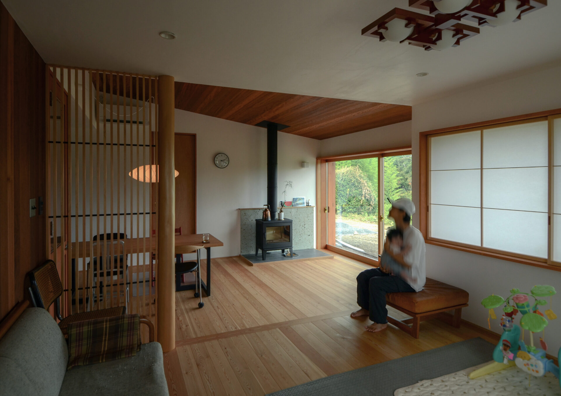主居室の東側には3.6メートルの大開口を設け、田園とその奥に広がる池からの風を通します。この窓は全開放でき、深い軒により外土間が半室内化され、内部空間を外へと大きく広げてくれます。風が抜け、光が差し込み、季節の変化を感じられる住まいです。空間構成の中心には薪ストーブを設置しました。ここは食事や団らん、仕事、遊びといった生活の様々な営みが重なる場所であり、名称や機能にとらわれない自由な場になります。住まいの中にメリハリを持たせ、明るいところ、暗がり、高さや広さ、風が通る場所やこもる場所など、環境の違いを設けることで、住む人がその時々で居心地の良いと感じる居場所を自然と選べるようになっています。天井高は落ち着きががでるようにあえて抑え、仕上げには無垢の木材、塗りや大谷石など、視覚的にも触覚的にも心地よい自然素材を選定しました。素材の色味はできる限り着色せず、経年変化を味わえるように工夫しています。