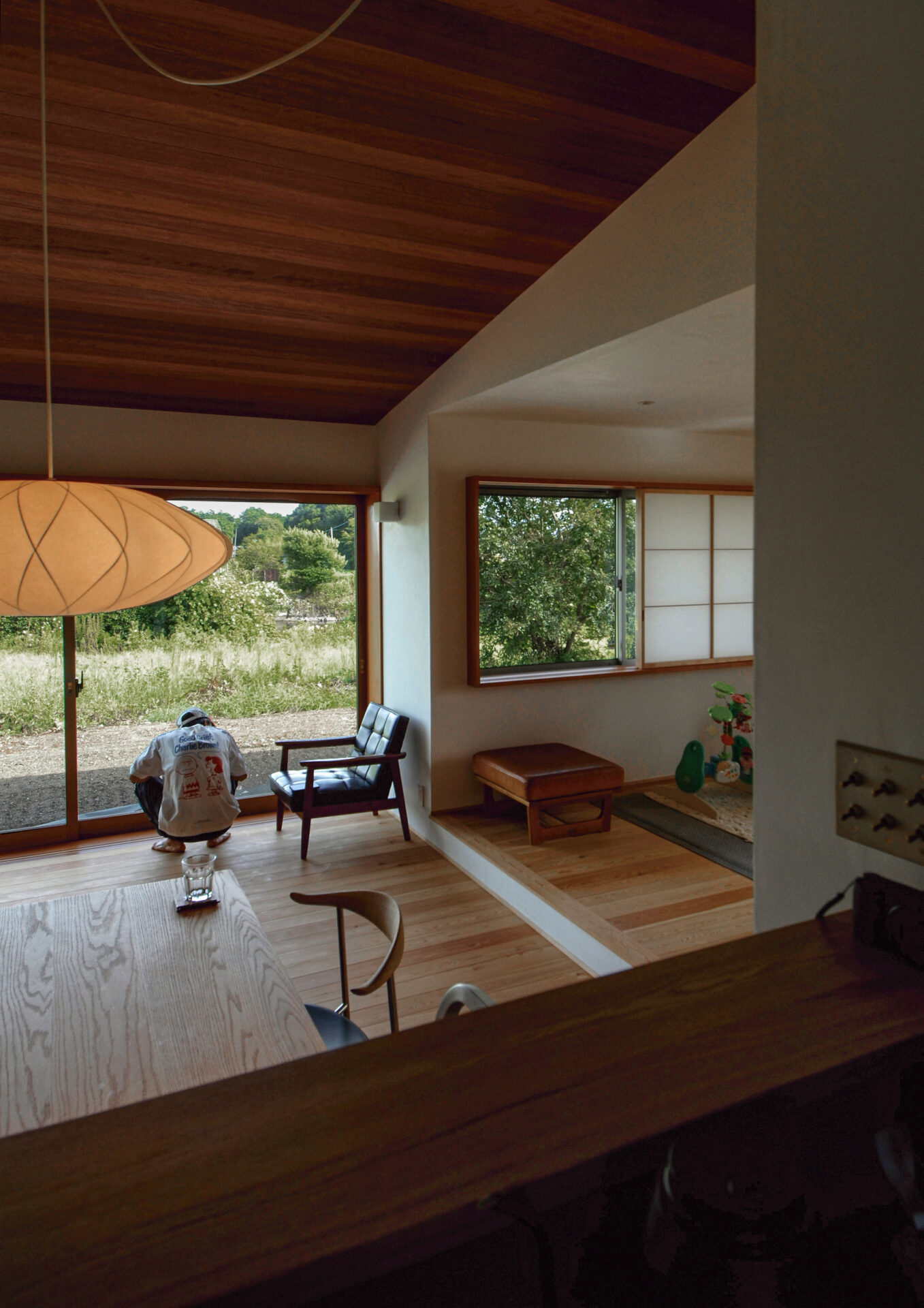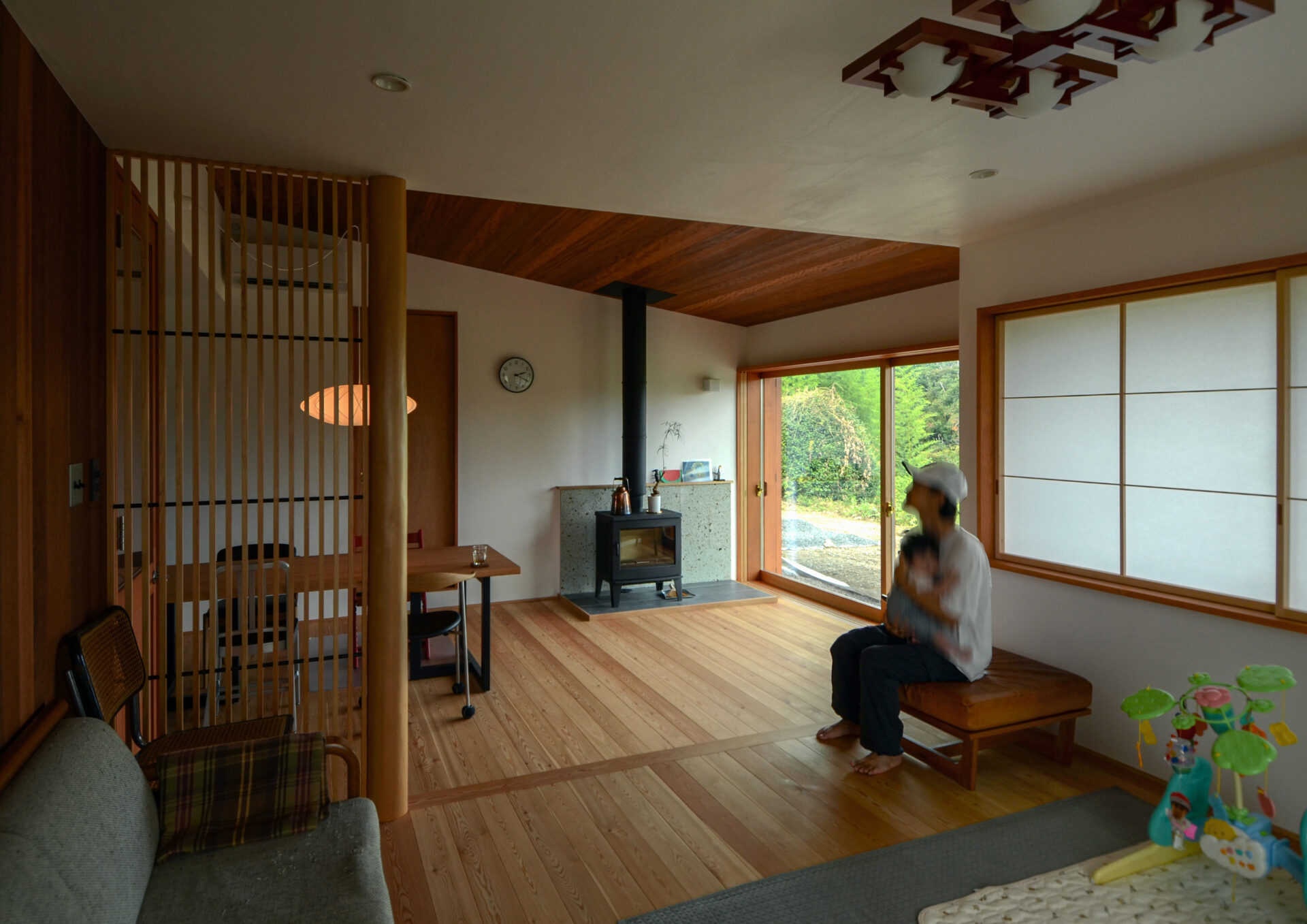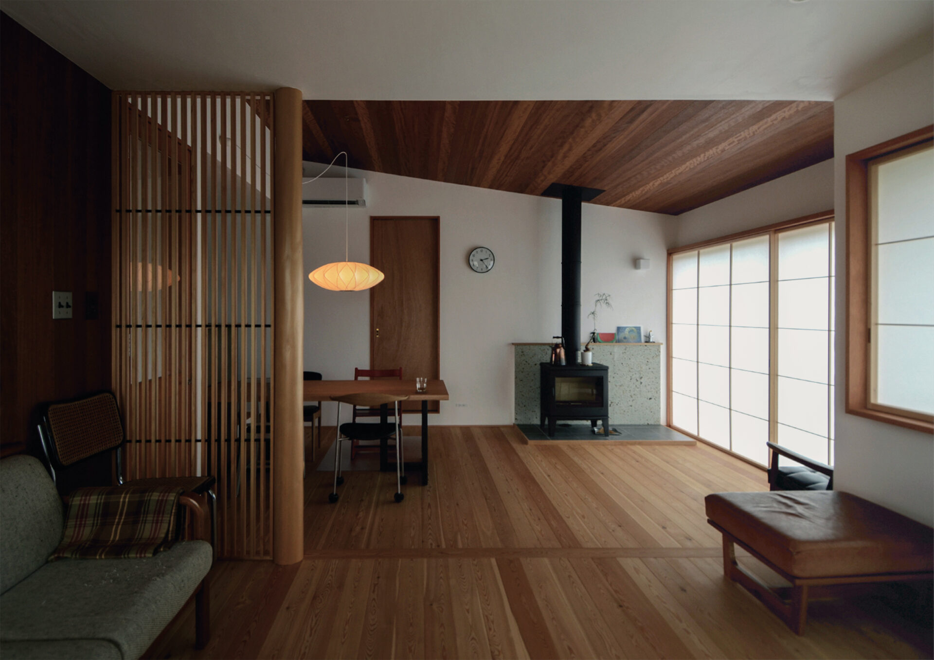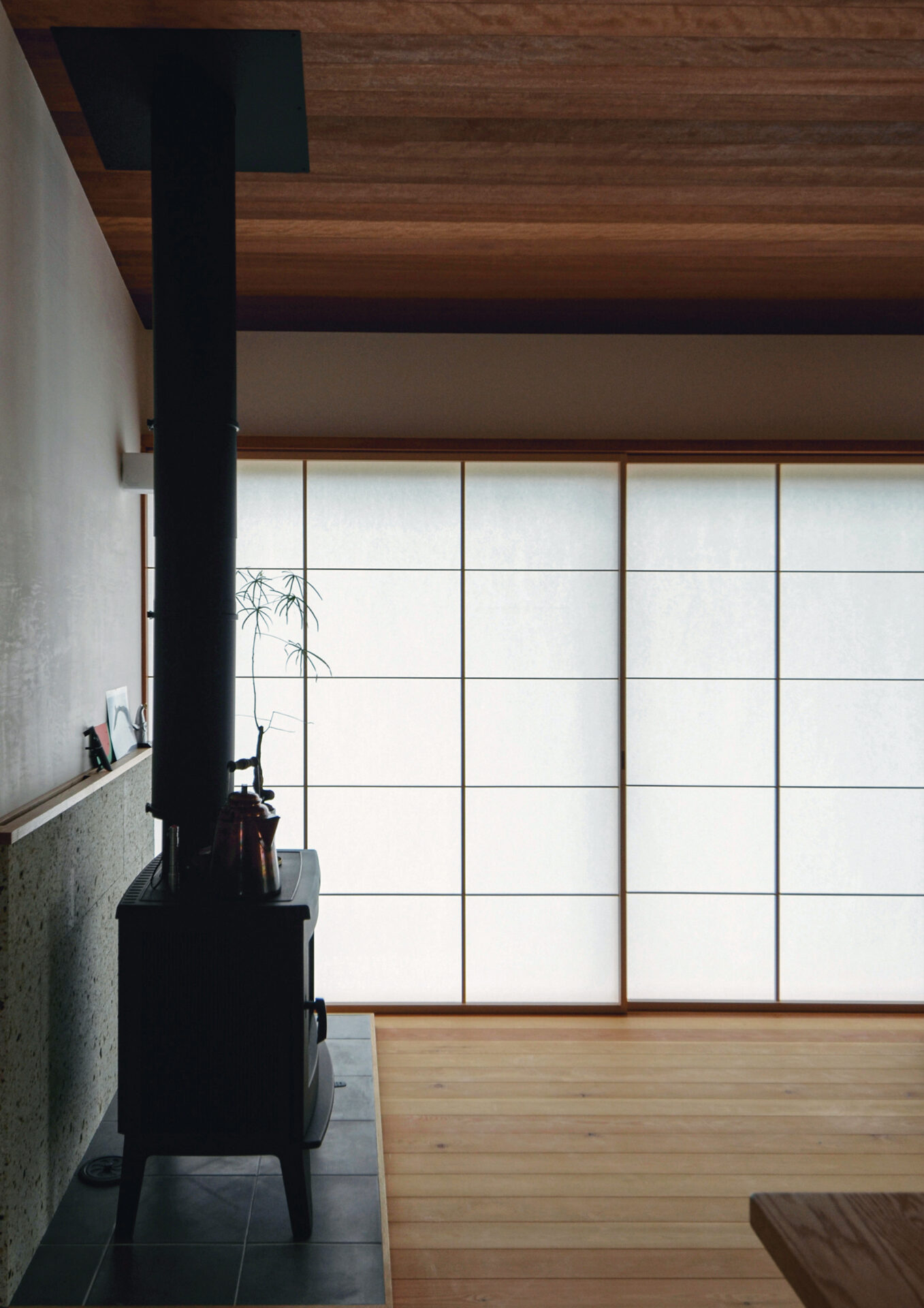 主居室の東側には3.6メートルの大開口を設け、田園とその奥に広がる池からの風を通します。この窓は全開放でき、深い軒により外土間が半室内化され、内部空間を外へと大きく広げてくれます。風が抜け、光が差し込み、季節の変化を感じられる住まいです。空間構成の中心には薪ストーブを設置しました。ここは食事や団らん、仕事、遊びといった生活の様々な営みが重なる場所であり、名称や機能にとらわれない自由な場になります。住まいの中にメリハリを持たせ、明るいところ、暗がり、高さや広さ、風が通る場所やこもる場所など、環境の違いを設けることで、住む人がその時々で居心地の良いと感じる居場所を自然と選べるようになっています。天井高は落ち着きががでるようにあえて抑え、仕上げには無垢の木材、塗りや大谷石など、視覚的にも触覚的にも心地よい自然素材を選定しました。素材の色味はできる限り着色せず、経年変化を味わえるように工夫しています。