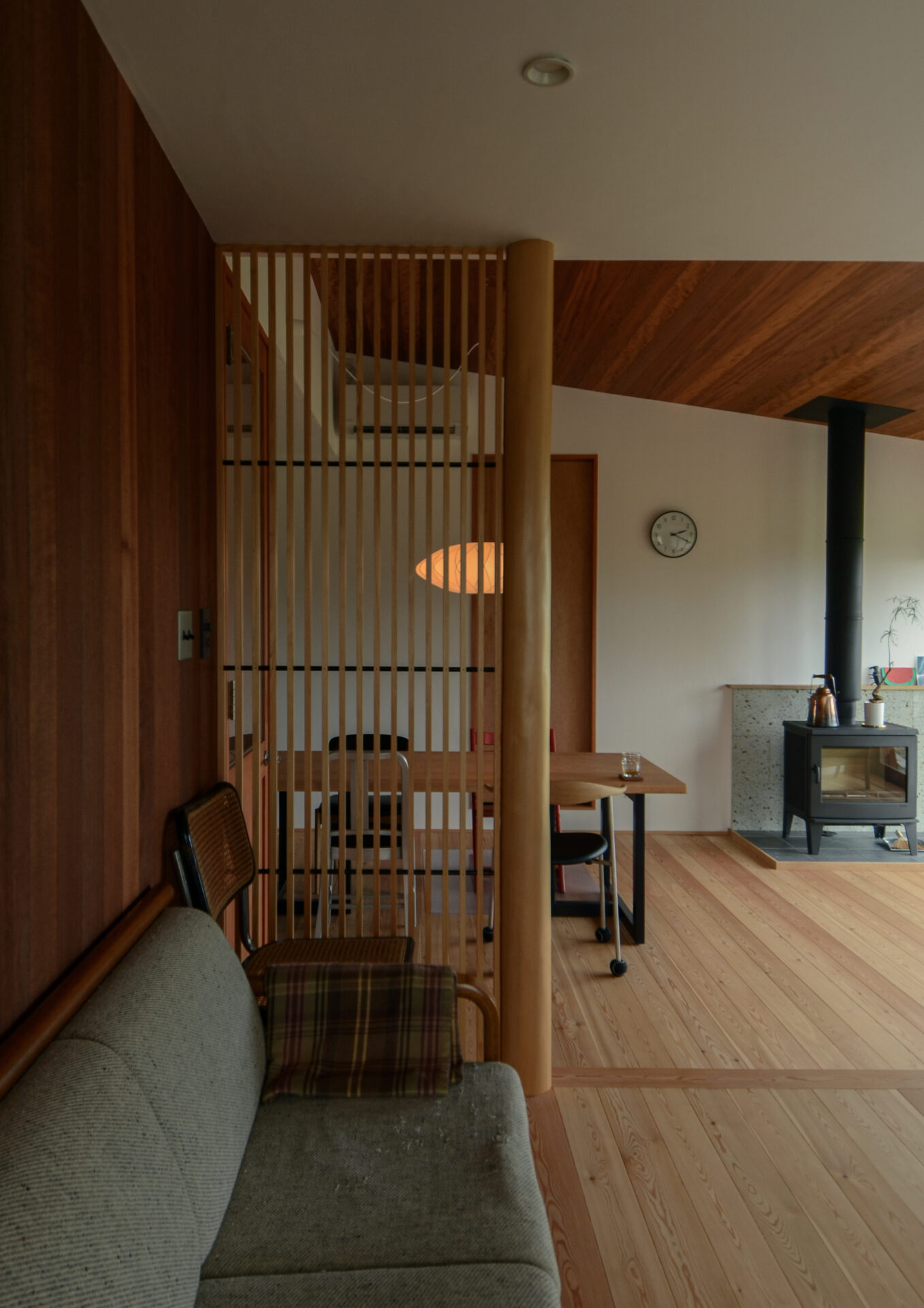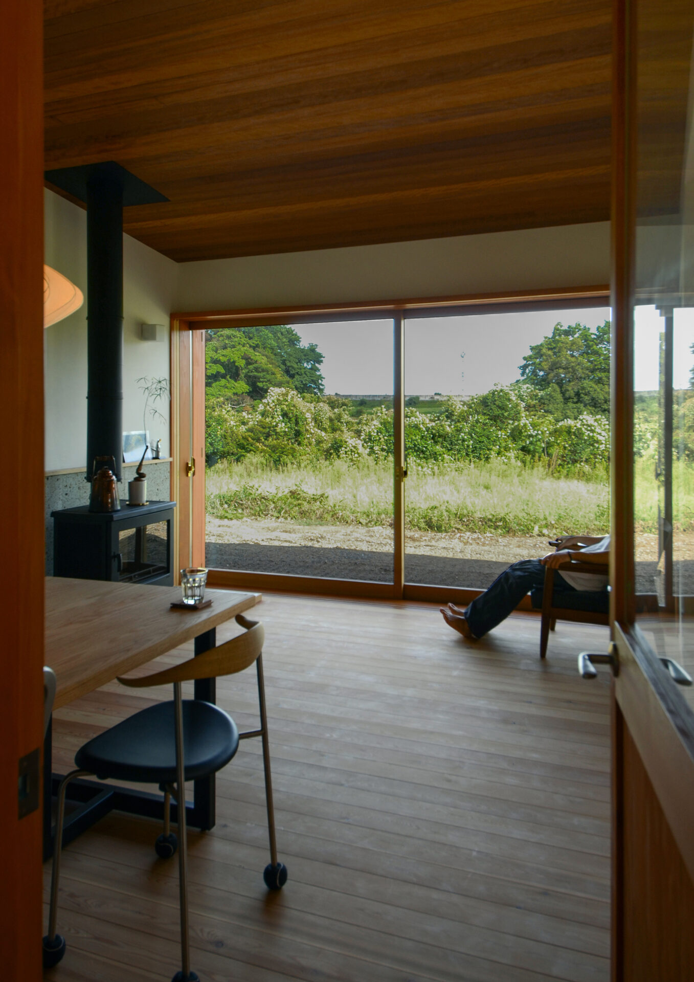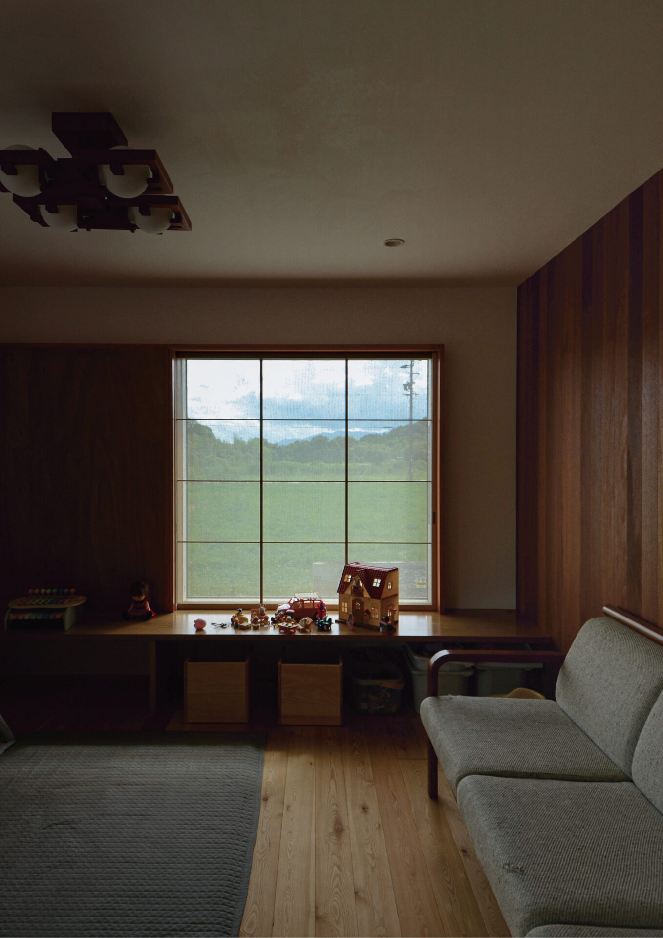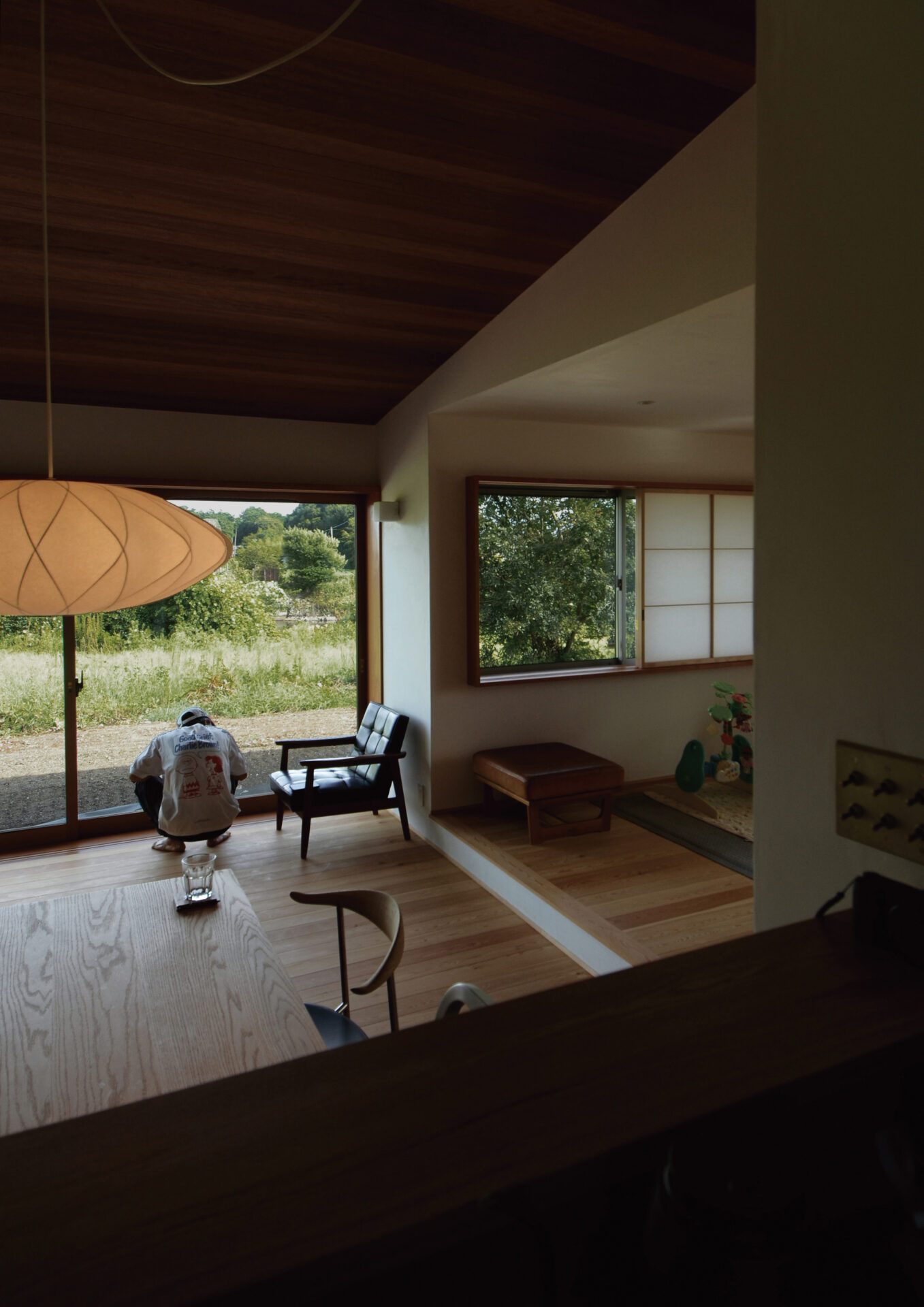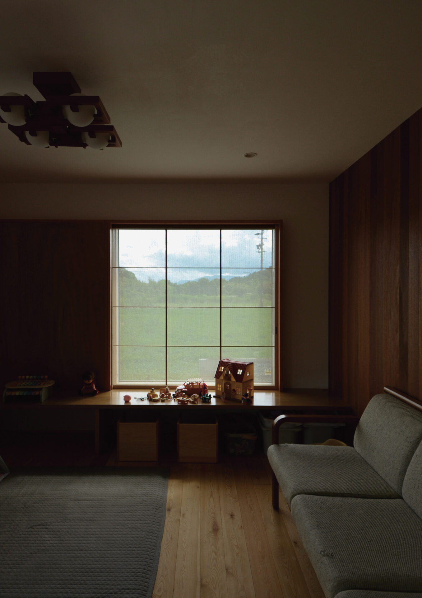 主居室の東側には3.6メートルの大開口を設け、田園とその奥に広がる池からの風を通します。この窓は全開放でき、深い軒により外土間が半室内化され、内部空間を外へと大きく広げてくれます。風が抜け、光が差し込み、季節の変化を感じられる住まいです。空間構成の中心には薪ストーブを設置しました。ここは食事や団らん、仕事、遊びといった生活の様々な営みが重なる場所であり、名称や機能にとらわれない自由な場になります。住まいの中にメリハリを持たせ、明るいところ、暗がり、高さや広さ、風が通る場所やこもる場所など、環境の違いを設けることで、住む人がその時々で居心地の良いと感じる居場所を自然と選べるようになっています。天井高は落ち着きががでるようにあえて抑え、仕上げには無垢の木材、塗りや大谷石など、視覚的にも触覚的にも心地よい自然素材を選定しました。素材の色味はできる限り着色せず、経年変化を味わえるように工夫しています。
