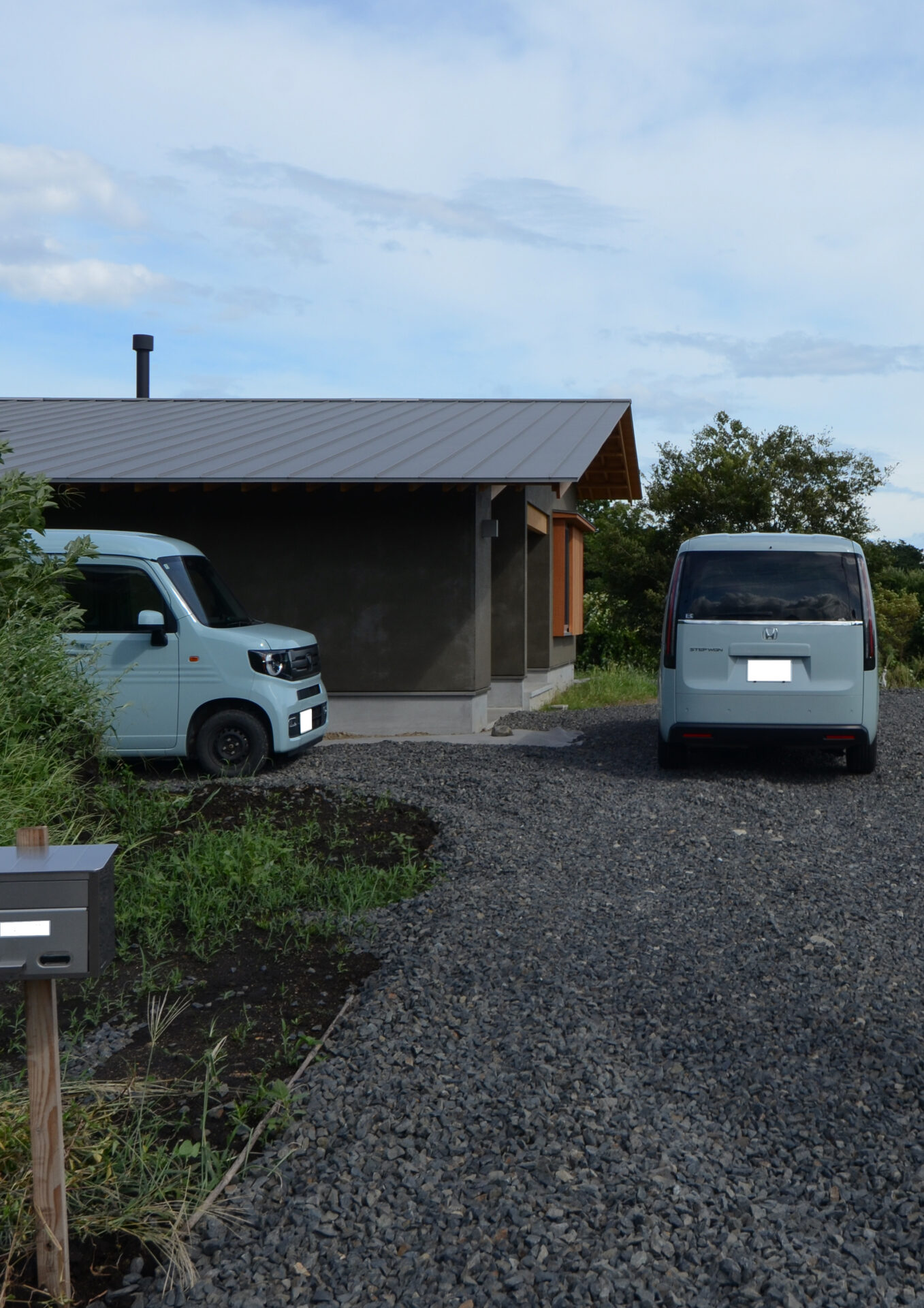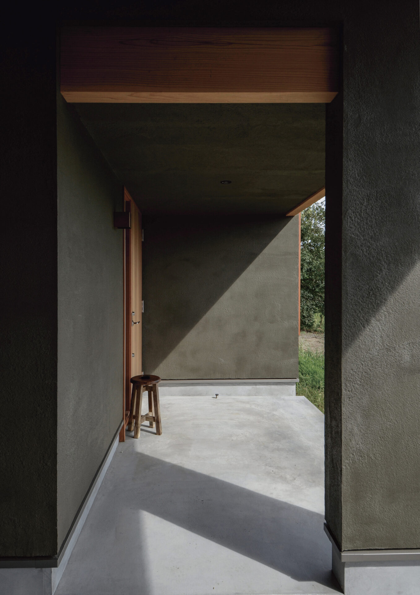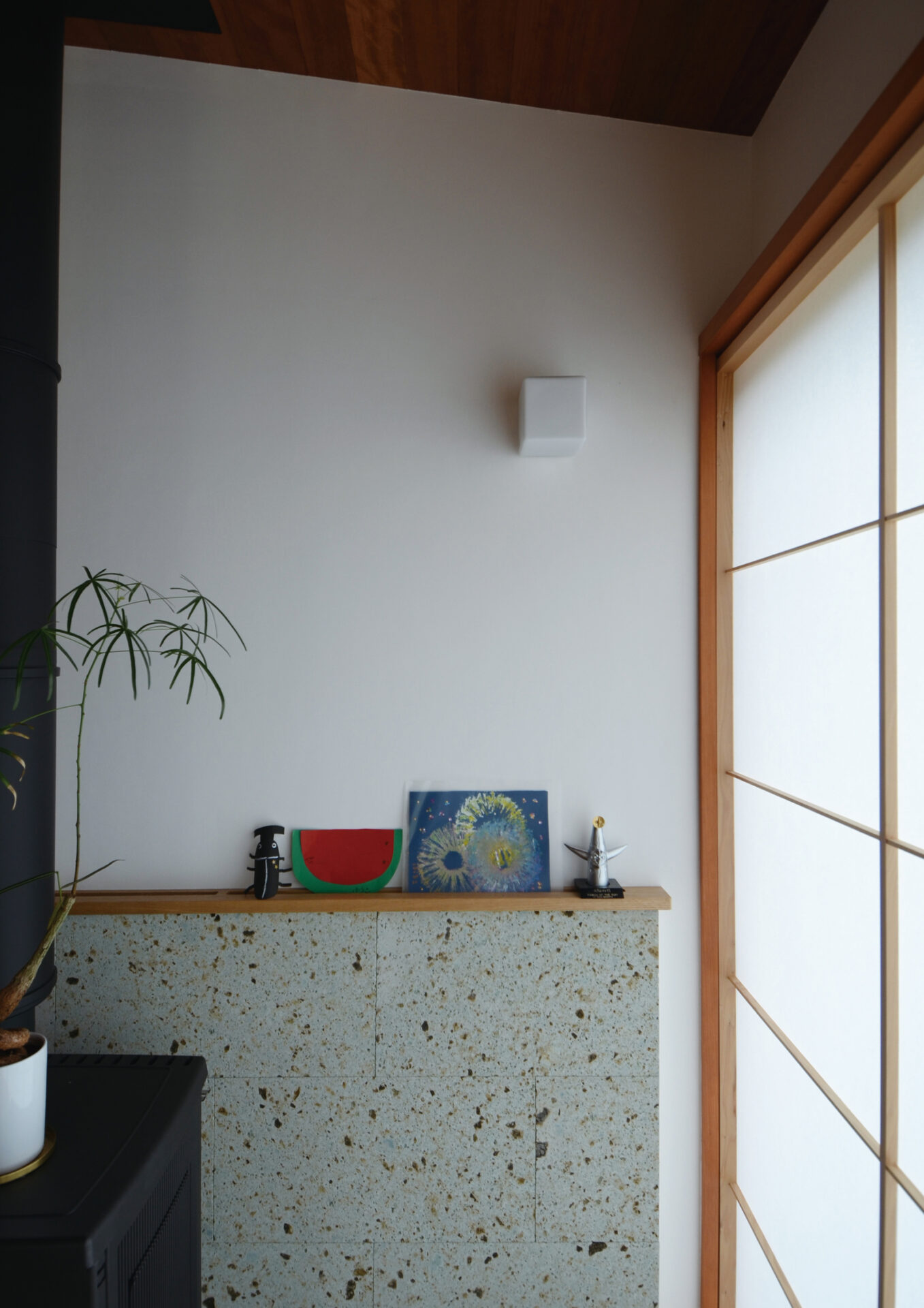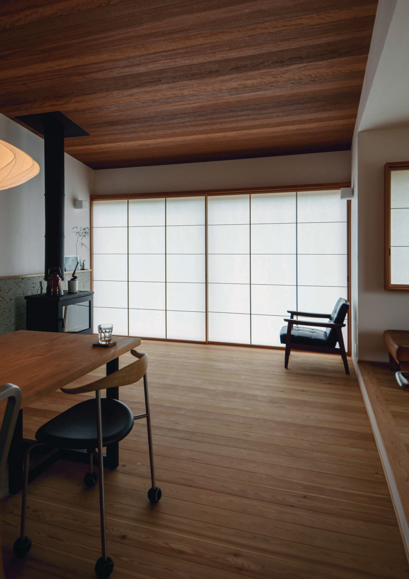 主居室の東側には3.6メートルの大開口を設け、田園とその奥に広がる池からの風を通します。この窓は全開放でき、深い軒により外土間が半室内化され、内部空間を外へと大きく広げてくれます。風が抜け、光が差し込み、季節の変化を感じられる住まいです。空間構成の中心には薪ストーブを設置しました。ここは食事や団らん、仕事、遊びといった生活の様々な営みが重なる場所であり、名称や機能にとらわれない自由な場になります。住まいの中にメリハリを持たせ、明るいところ、暗がり、高さや広さ、風が通る場所やこもる場所など、環境の違いを設けることで、住む人がその時々で居心地の良いと感じる居場所を自然と選べるようになっています。天井高は落ち着きががでるようにあえて抑え、仕上げには無垢の木材、塗りや大谷石など、視覚的にも触覚的にも心地よい自然素材を選定しました。素材の色味はできる限り着色せず、経年変化を味わえるように工夫しています。