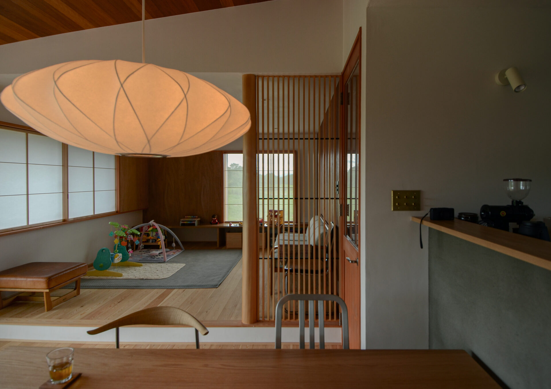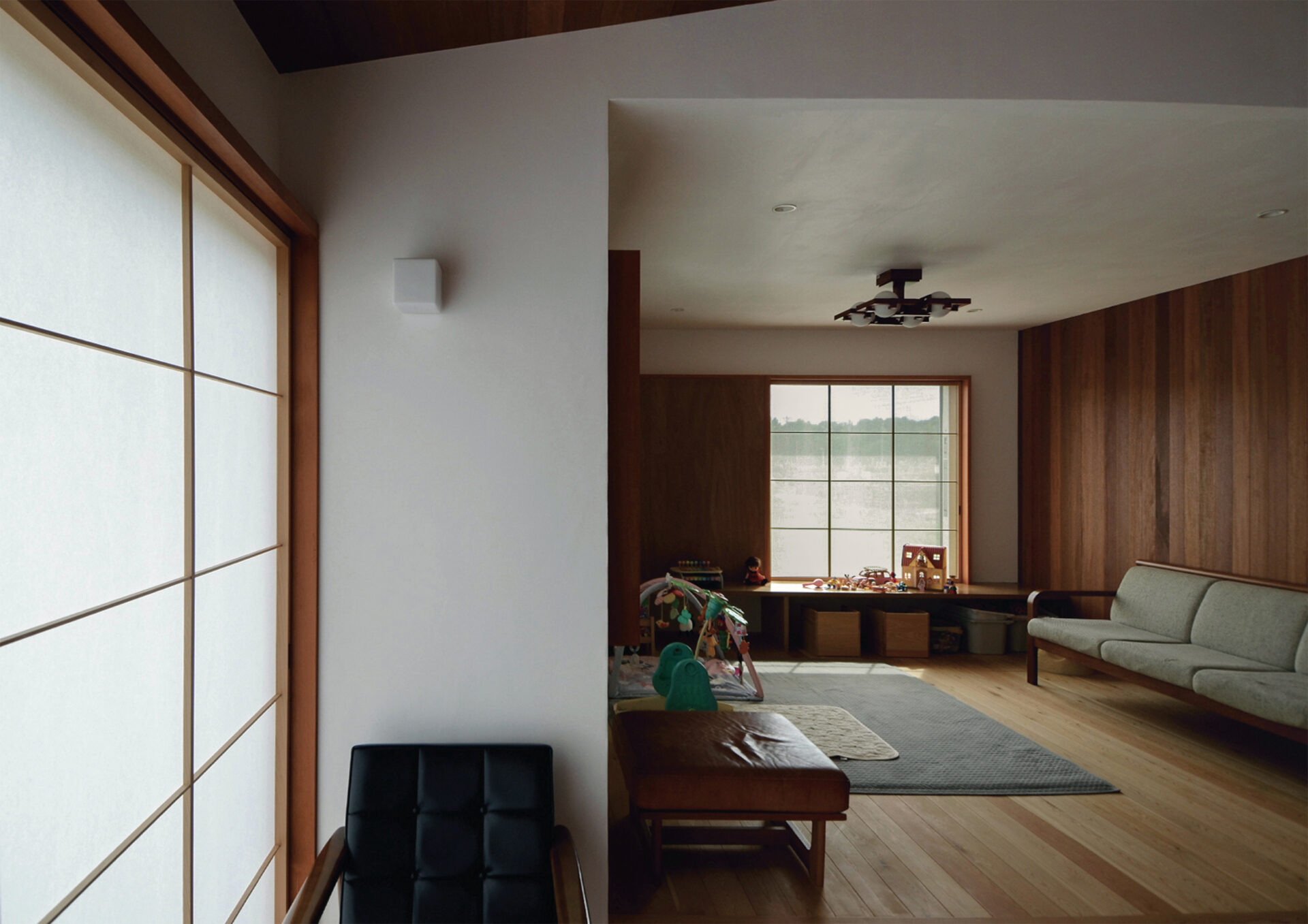 計画にあたって望まれたのは、「立地を生かし、家族みんなが楽しく暮らせる住まい」であること。そのため、建物は敷地西側の道路から大きく後退させて配置し、軒高を抑え、周囲の風景の中に溶け込むようにしました。平屋建てとすることで、竹林や田園といった自然に視線がいき、屋外と室内のつながりを豊かに感じられる構成になっています。建物の屋根は軒の深い切妻屋根とし、雨風から木製建具や外壁を守りながら、夏の直射日光を遮り、雨の日でも窓を開けて心地よい通風(冬は西から、夏は東、南からの風)を確保できます。この深い軒は、外と内を曖昧にする「中間の場所」をつくり、縁側のような、内でも外でもないおおらかな空間として、多様な使われ方にできる場となっています。