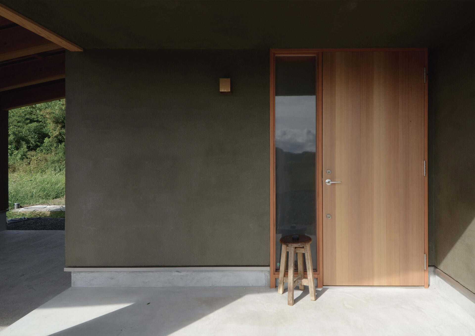敷地は、北側に竹林と池が広がり、東側・南側には田園風景(東、南東の田は所有地)が続きます。西側には道路を挟んで遠くに山を望むことができ、四方を自然に囲まれた、静かで落ち着いた環境に位置しています。都心部に建つ住宅と比べて、日当たりや通風に恵まれ、敷地や建築面積にも余裕のあるこの土地では、プライバシーを確保しながらも、暮らしの雰囲気や気配が地域に適度に伝わる、温かくおおらかな住まいのあり方を目指しました。そして、この場所の風土と調和し、年月を経ても古びることのない、美しい佇まいと素材を探りました。